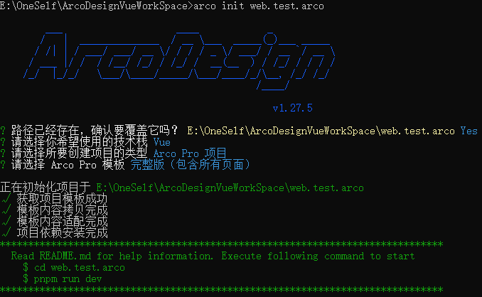 ? 路径已经存在,确认要覆盖它吗? E:\OneSelf\ArcoDesignVueWorkSpace\web.test.arco Yes