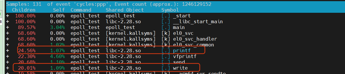 会在当前目录生成perf.data文件,执行perf report,会看到printf和write占用的CPU比较高,删除上面服务的printf和write函数,重新压测