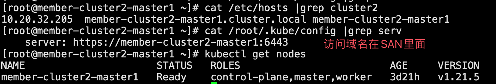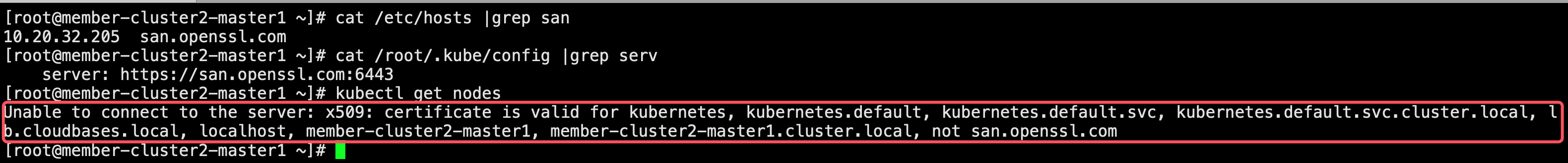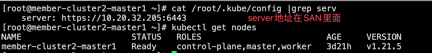 DNS:kubernetes, DNS:kubernetes.default, DNS:kubernetes.default.svc, DNS:kubernetes.default.svc.cluster.local, DNS:lb.zmc.local, DNS:localhost, DNS:member-cluster2-master1, DNS:member-cluster2-master1.cluster.local, IP Address:10.234.0.1, IP Address:10.20.32.205, IP Address:127.0.0.1