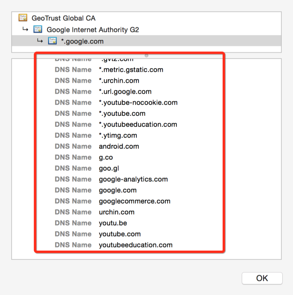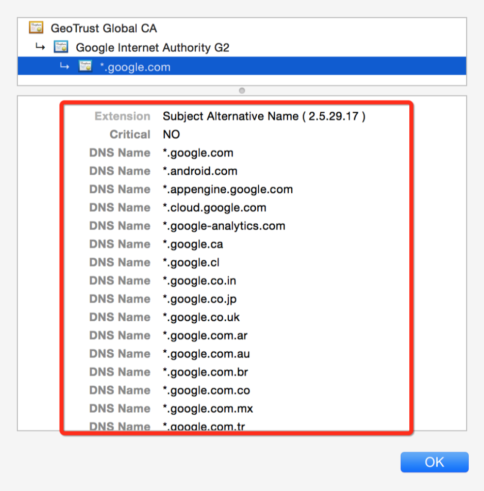 这里可以看到,这张证书的 Subject Alternative Name 段中列了一大串的域名,因此这张证书能够被多个域名所使用。对于 Google 这种域名数量较多的公司来说,使用这种类型的证书能够极大的简化网站证书的管理。