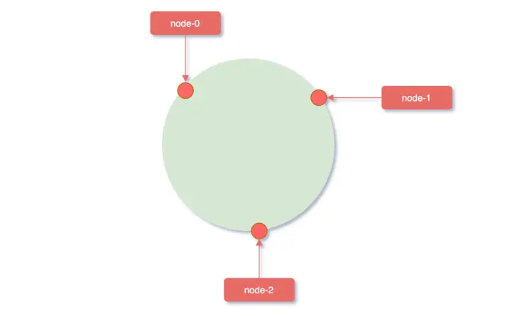 将服务器节点映射到哈希环:使用哈希函数将服务器映射到虚拟的哈希环上,一般可以使用服务器节点机器的 IP 地址或者机器名作为哈希函数的计算值。假设有 3 个服务器节点:node-0、node-1、node-2,通过哈希函数计算出服务器 IP 地址的哈希值,并将其分布在哈希环上