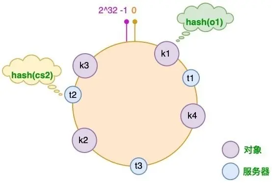 将对象映射到服务器节点:找到对象的哈希值在哈希环上的位置,从该位置开始沿哈希环顺时针寻找,遇到的第 1 台服务器就是该对象的存储节点服务器,将该对象映射