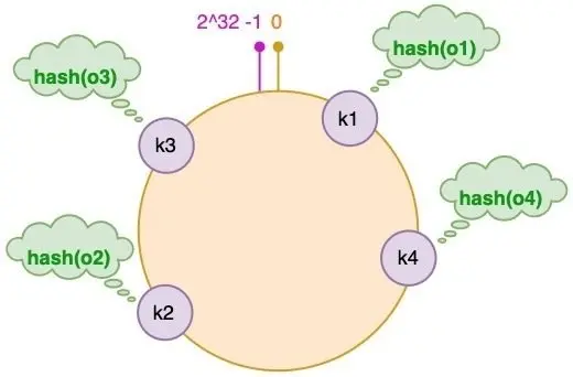 将数据映射到哈希环:使用相同的哈希函数计算需要存储的数据的哈希值,并将数据映射到哈希环上。假设有 4 个对象:o1、o2、o3、o4,通过哈希函数计算出对象的哈希值,并将其分布在哈希环上