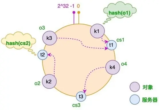 到该服务器上。如图所示,对象 o1 被映射到 cs1 上,对象 o2 被映射到 cs2 上,对象 o3 被映射到 cs1 上,对象 o4 被映射到 cs3 上